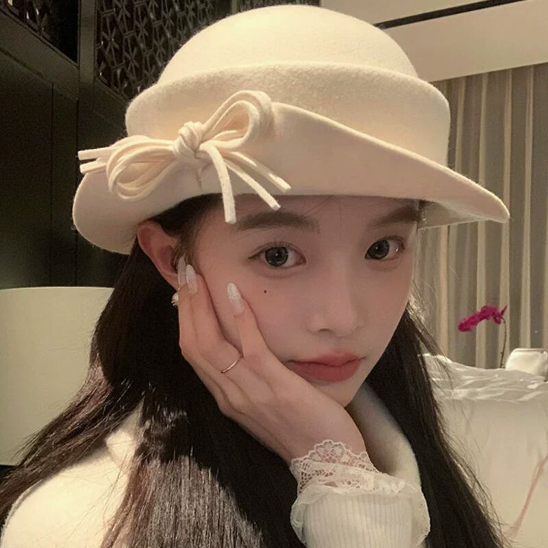 リボン付きベレー帽 ウール エレガント 白/黑